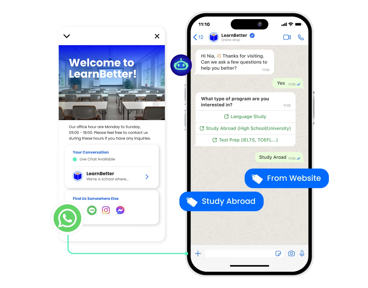 Turn website traffic into conversations by routing visitors to WhatsApp, LINE, or Messenger with just one click. From there, automated flows qualify leads, apply smart tags, and deliver the right content—ensuring no inquiry goes unanswered
