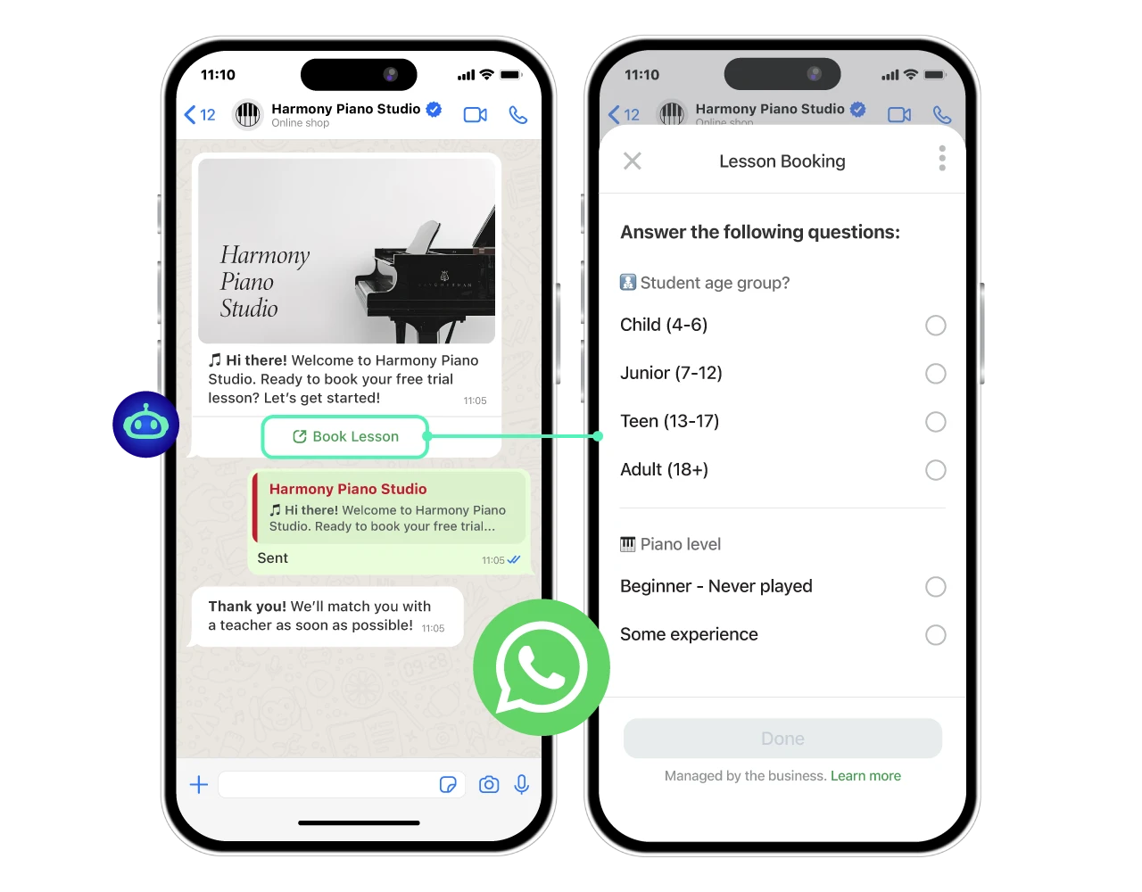 Once they click “Book Lesson,” WhatsApp flow collects key info like age and availability, applies smart tags, and auto-sends confirmations and reminders—saving your team time while assigning students to the right class.
