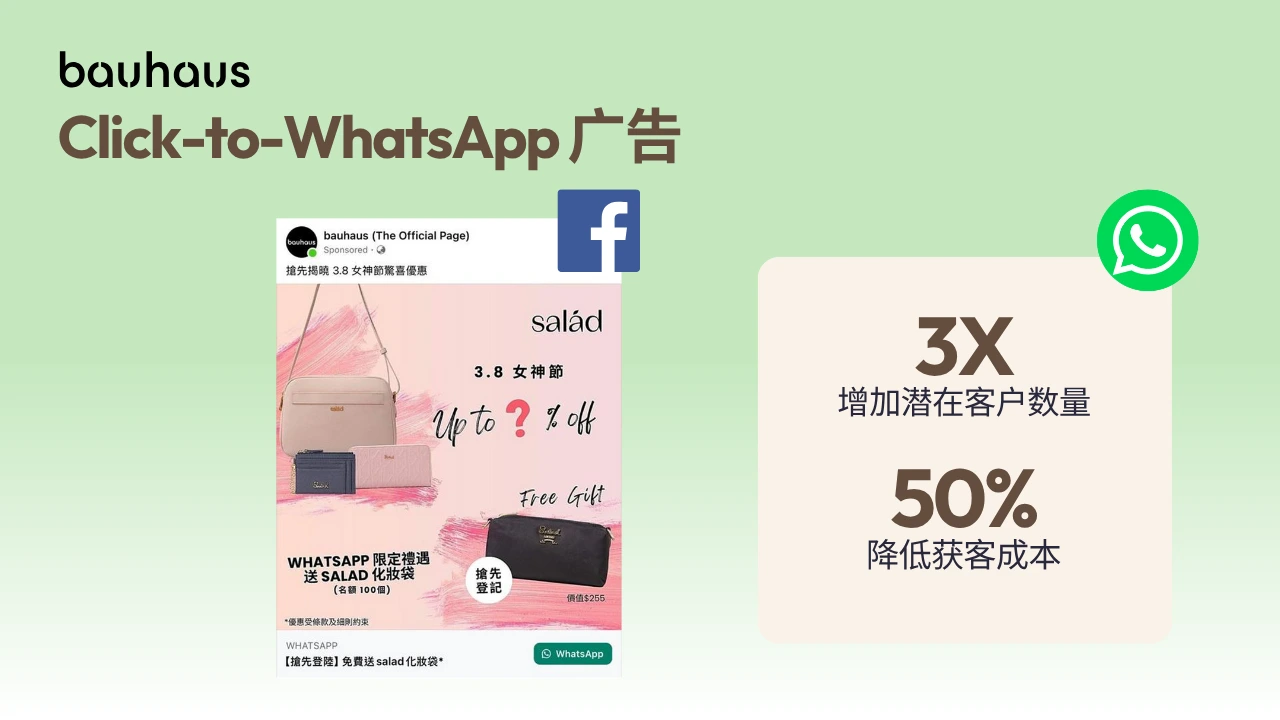 潜在客户只需在 Facebook 或 Instagram 广告上点击,即可与 Bauhaus 展开 WhatsApp 对话,团队第一时间解答客户疑问及提供购物建议,有效缩短考虑周期、加速销售转化,并带来三倍的潜在客户数量,而获客成本则降低了一半。
