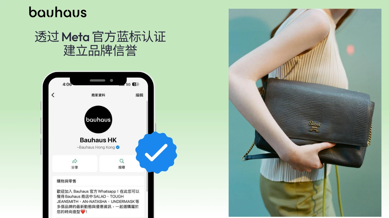透过 Omnichat,Bauhaus 获得 Meta 官方认证的 WhatsApp Business API 账号,品牌名称旁显示 Meta 官方蓝标,能让客户确信自己正与合法、可靠的品牌官方渠道互动,从而有效建立品牌信誉度和信任度。