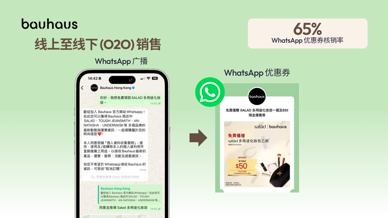 Bauhaus 善用 WhatsApp 功能,完善线上互动并转化为门店销售,WhatsApp 优惠券在 Bauhaus 门店达到了 65% 核销率,实现降本增收。