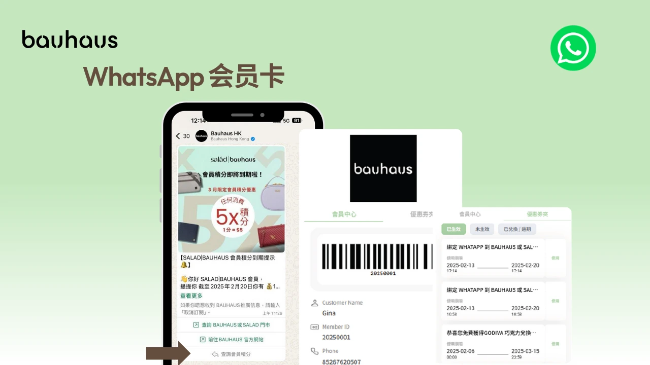 所有主要会员信息,包括会员级别、实时积分余额、可用优惠券等,皆集中在 WhatsApp 数字会员卡上,并于 WhatsApp 对话界面内随时轻松取用。