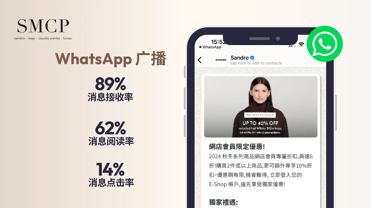 SMCP 的官方 WhatsApp 账号获得 Meta“官方蓝标认证”,让客户能安心地与品牌官方代表交流。即使发送 WhatsApp 广播消息,其点击率亦超过 14%,带动了网店及门店客流量显著上升,充分优化了营销资源和效益。