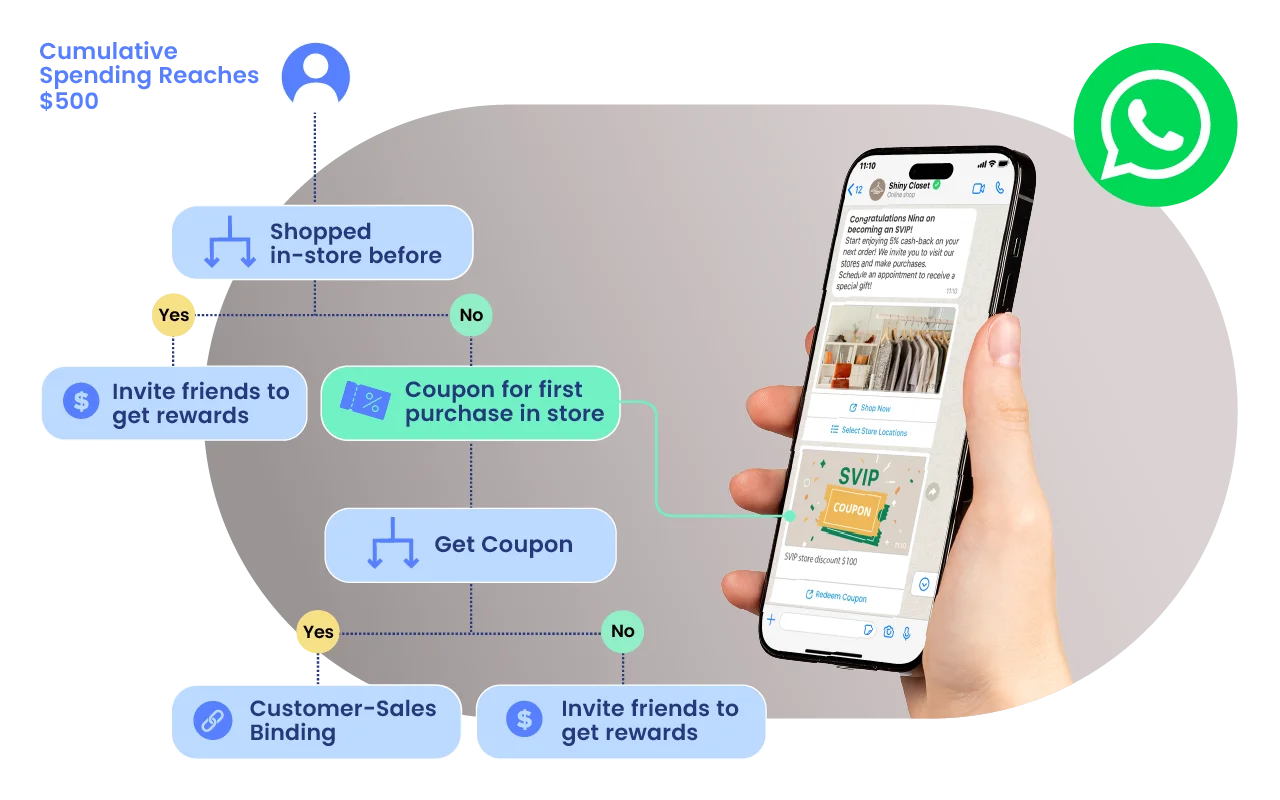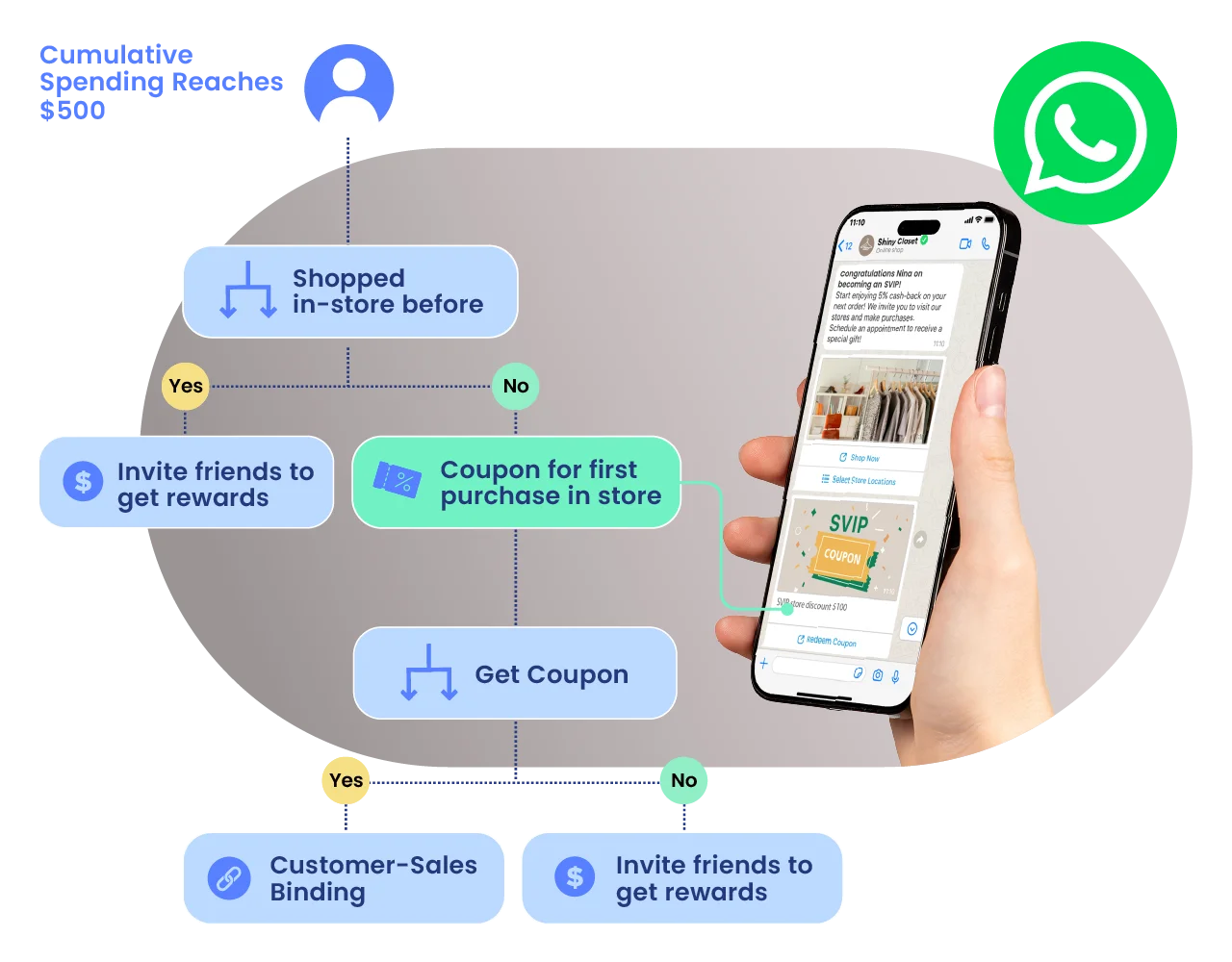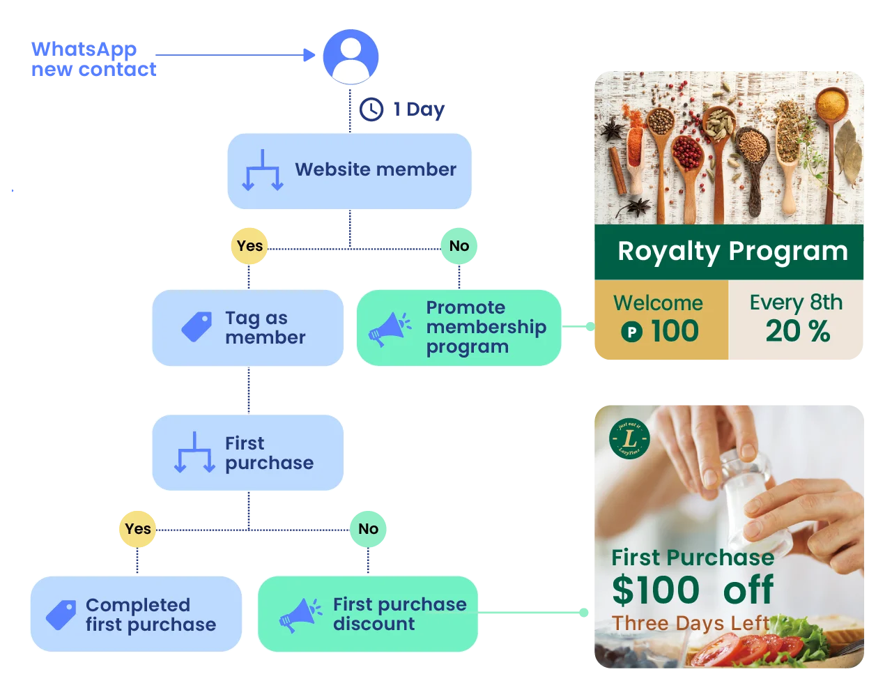 Automatically send tailored guidance messages based on whether WhatsApp friends have become official website members or completed their first purchase.