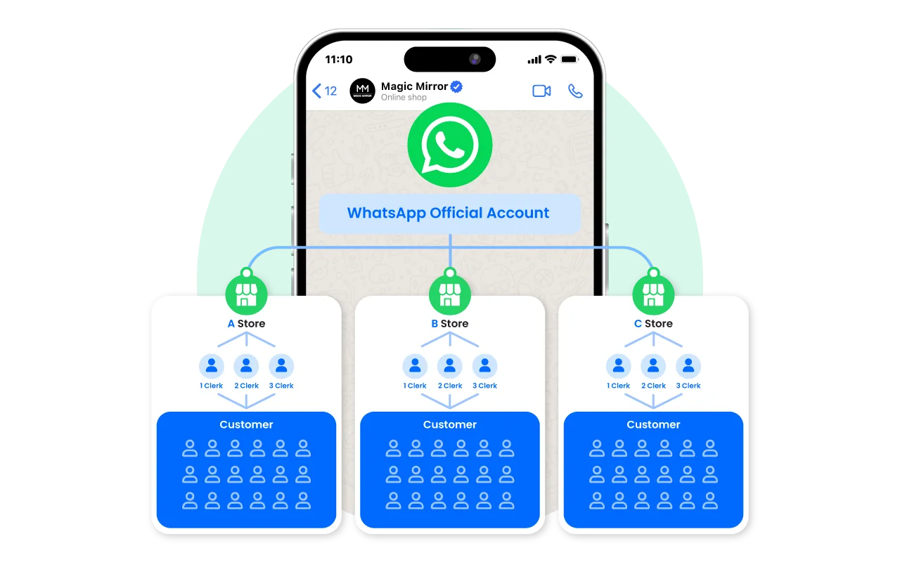 One WhatsApp account for multiple stores and sales agents’ collaboration.