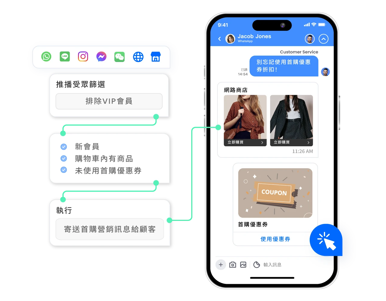 LINE、FB、WhatsApp 名單就是你的熟客流量池,更能進一步依照互動紀錄篩選推播對象!