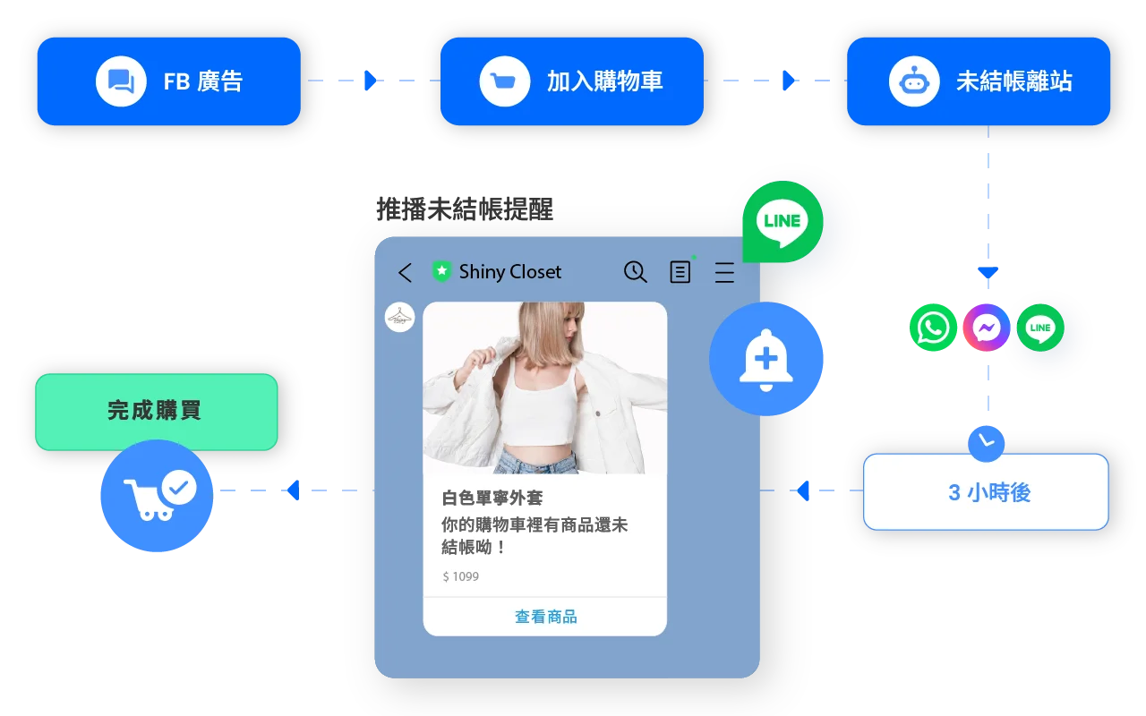 透過即時通訊軟件,傳送未結帳提醒及商品資訊