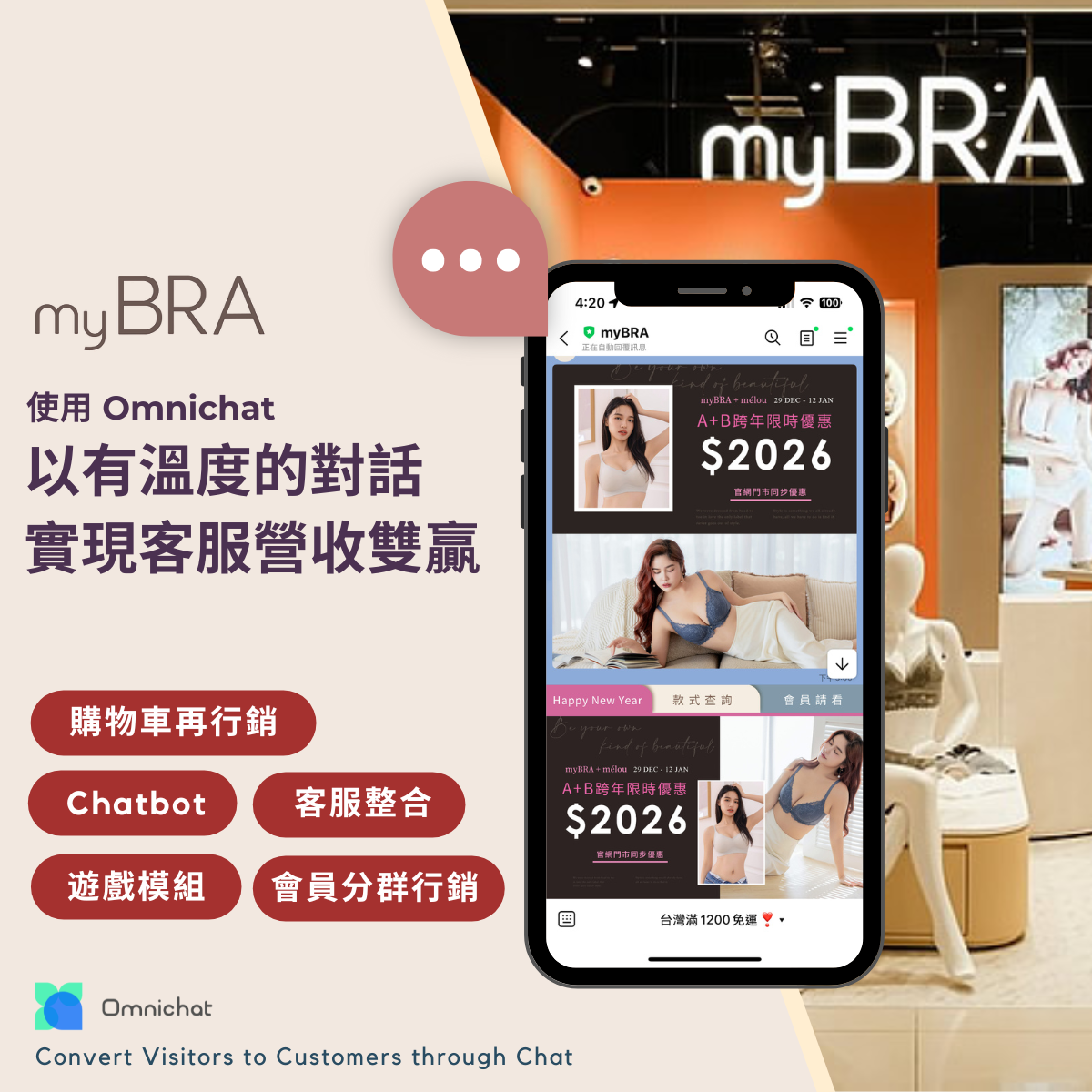 myBRA 購物車再行銷 官網顧客行銷 一站式客服系統 廣播訊息 分眾貼標籤 客戶資料與購物紀錄 自動化 Chatbot 導購連結 優惠券模組 遊戲化行銷 全渠道顧客身份互通 LINE 圖文選單 FB / IG 留言自動回覆