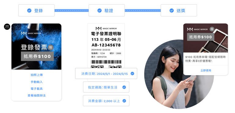 推動「購買指定商品並登錄發票」,即可獲得贈獎或參加抽獎的活動,刺激指定產品銷量。