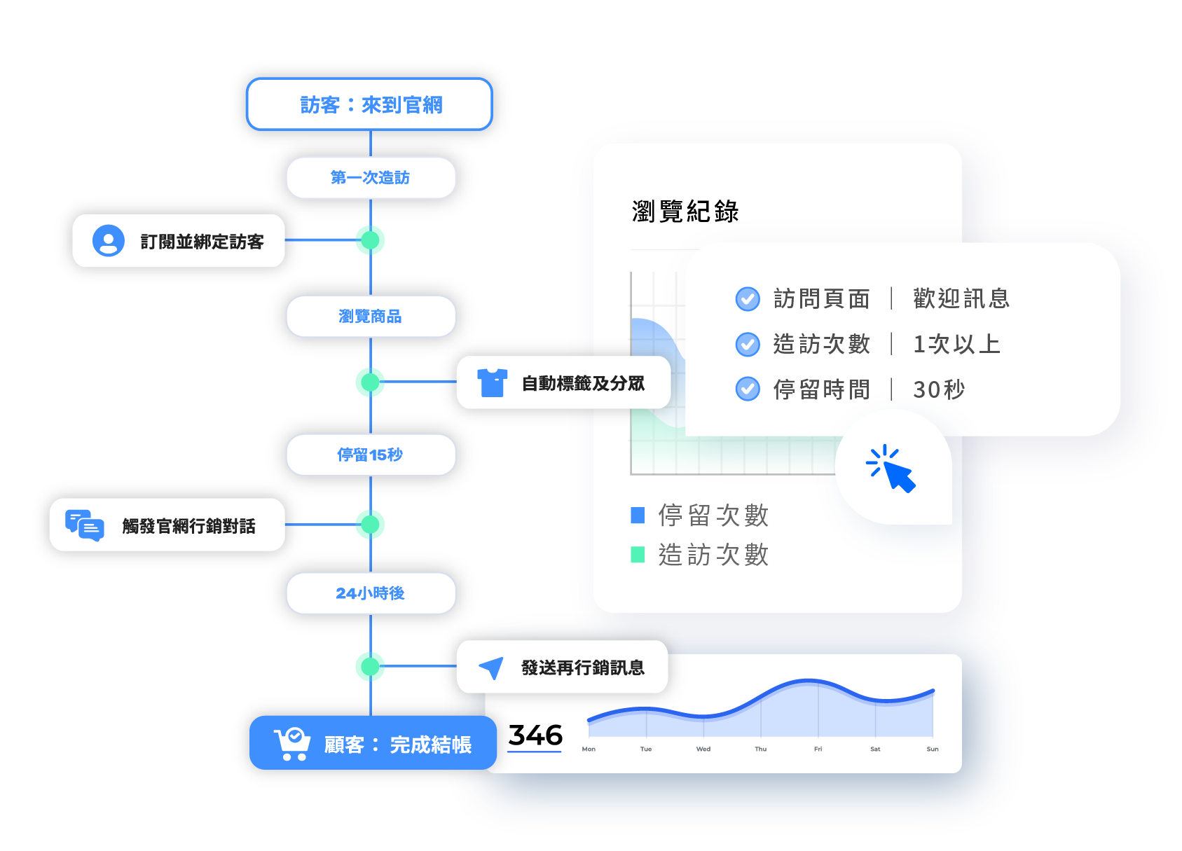 追蹤顧客瀏覽網站行為,包括瀏覽頁面、瀏覽次數、停留時間。