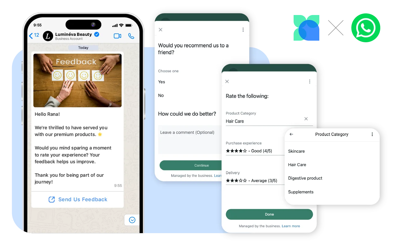 Collect valuable insights through WhatsApp feedback forms that make it easy for customers to share their opinions. This helps businesses better understand customer needs and improve the overall experience.