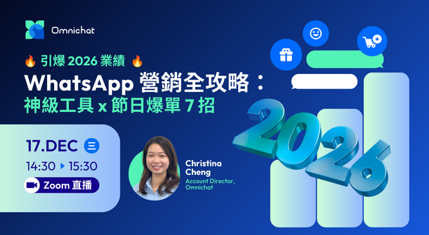 【引爆 2026 業績】WhatsApp 營銷全攻略:神級工具 x 節日爆單 7 招 講者 Omnichat | Christina Cheng, Account Director 資訊 活動類型 | 網上研討會 活動日期 | 2025/12/17 星期三 活動時間 | 14:30 -15:30 活動地點 | Zoom 立即登記
