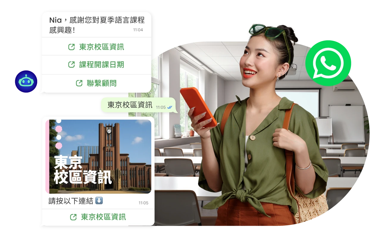 自動化跟進:當家長或學生連接 WhatsApp 後,自動化流程即時標籤其興趣科目,發送課程資料或早鳥優惠,並自動安排後續跟進,助團隊輕鬆轉化並吸納更多新生。