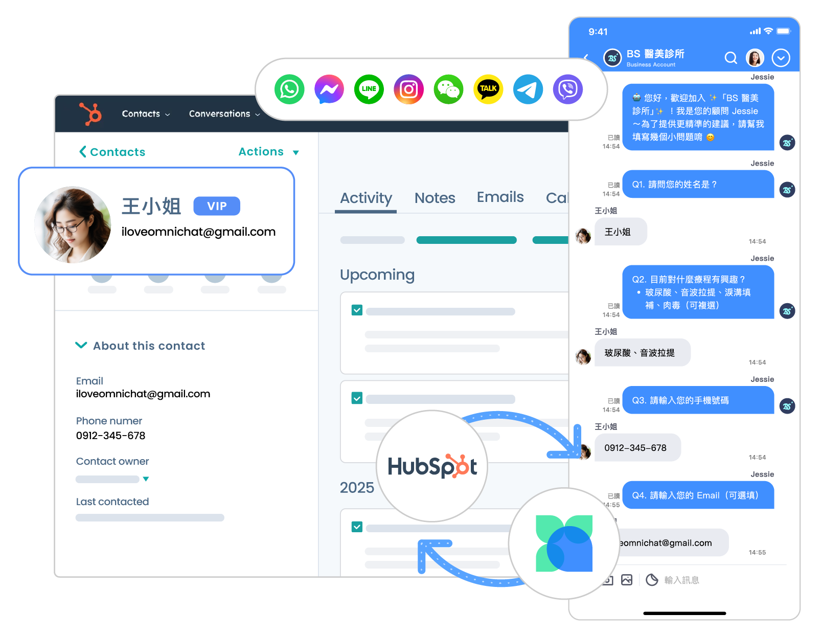 將 HubSpot 聯絡人及自訂欄位自動同步至 Omnichat。當您於 Omnichat 回覆來自 WhatsApp、LINE 或 Messenger 訊息時,直接查閱完整的顧客資料與標籤,從而提供更優質的顧客服務。