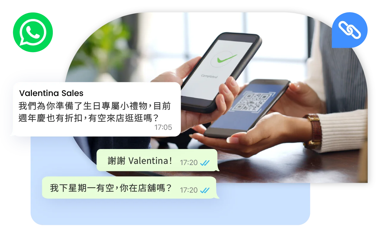 顧客可透過 QR code 或專屬連結,在 WhatsApp 直接綁定指定銷售人員,開啟一對一個人化對話。