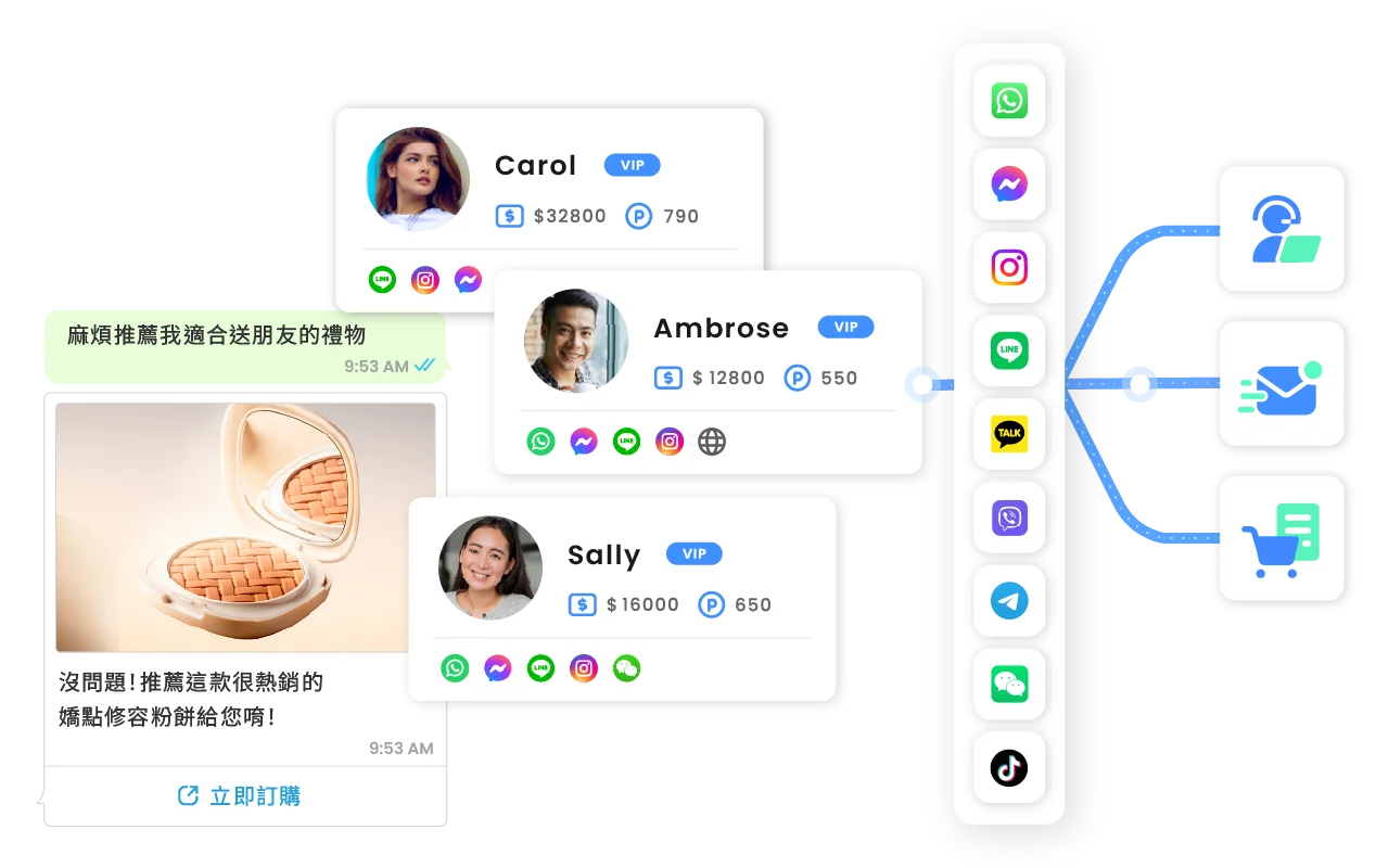 跨渠道引流顧客,一鍵綁定 WhatsApp、Facebook、Instagram 和 LINE 上的身份。